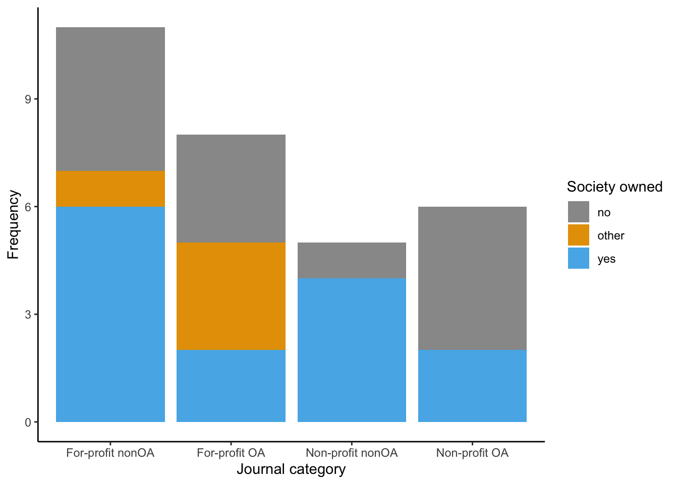 This script creates a figure showing how many journals per category (for-profit OA, for-profit noOA, not-for-profit OA and not-for-profit noOA) are owned by the societies, different institutions (other) or solely by publishers.